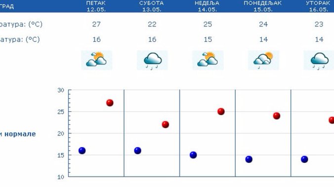Vetar će biti slab i umeren, na planinama povremeno jak, južni i jugozapadni, a na jugu Banata i istoku slab i umeren, jugoistočni. Najniža temperatura kretaće se od deset do 17, a najviša dnevna od 24 do 28 stepeni Celzijusa.