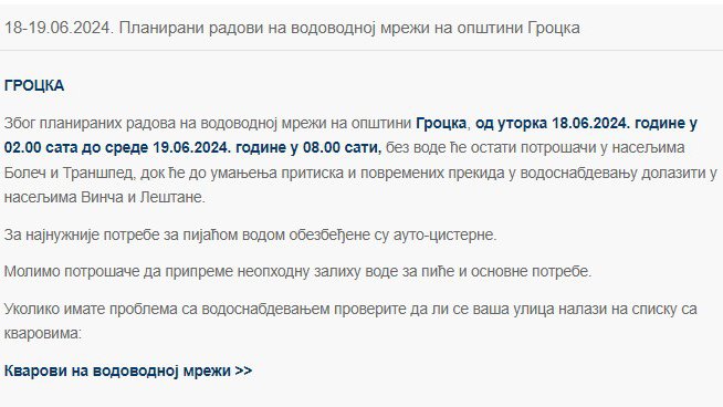 Dva naselja u opštini Grocka ostaće bez vode večeras u toku noći zbog planiranih radova.