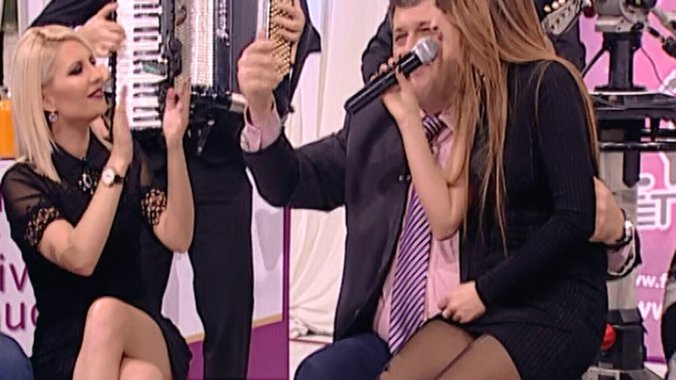 Posle je i Marko Bulat, koji je sedeo odmah pored voditelja, odlučio da mu sedne u krilo dok je pevao pesmu "Poslednji boem" Šekija Turkovića.