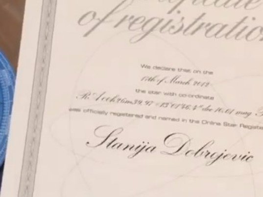 Među dokumentima se nalazi i ova uspomena, poklon, zvezda sa neba. Dobila sam je od nekog ko više nije znao šta meni da pokloni, pa mi je poklonio zvezdu sa neba koja nosi ime Stanija - otkrila je pevačica.