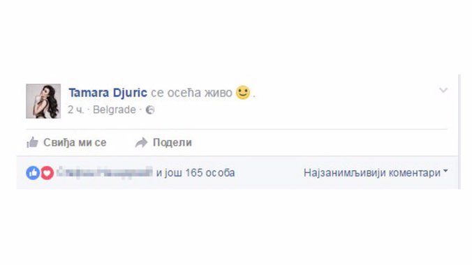 - Tamara Đurić se oseća živo - napisala je staleta na svom profilu na društvenoj mreži Fejsbuk.