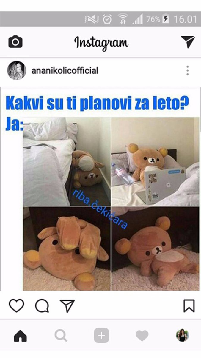 Pevačica je sa prijateljima na ovoj društvenoj mreži podelila fotografiju na kojoj je pokazala kako će provesti leto, a njeno stanje ilustrovao je plišani meda koji u sve četiri situacije leži izvrnut.