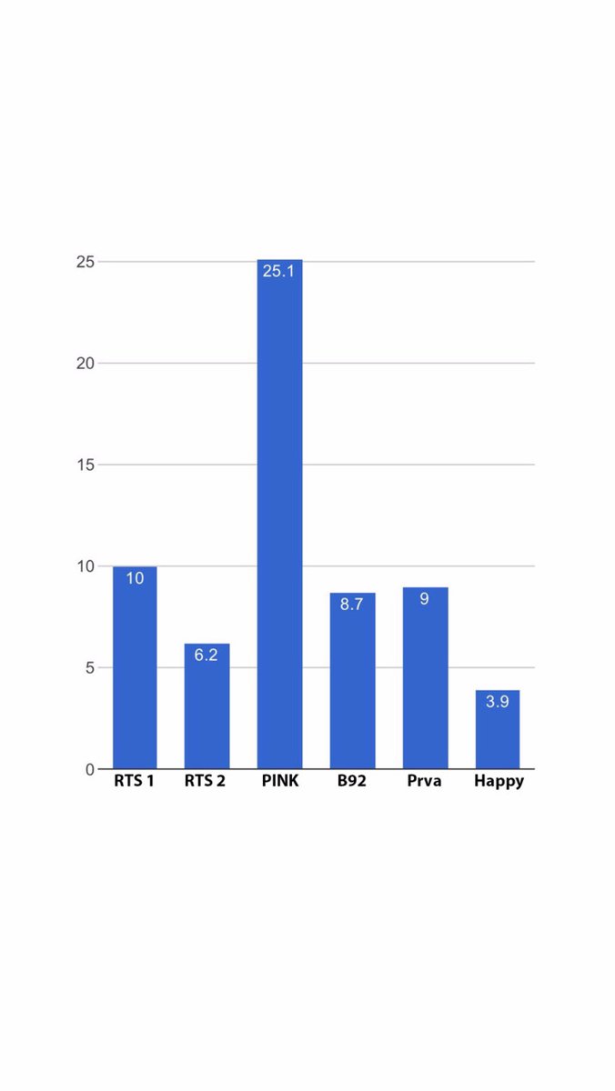 Pink je bio najgledaniji i duplo gledaniji od emitera koji su zauzeli drugo i treće mesto. Televizija Pink, večeras je oborila sve rekorde. Budite i sledećeg četvrtka uz najgledaniju televiziju u regionu, jer vas čeka još jedna nezaboravna i spektakularna epizoda šoua "Ja imam talenat".V. T.