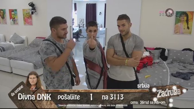 Mrš obojica! Ja sam mnogo emotivna osoba, i meni se mnogo brzo neko svidi, kad mi se svidi, onda se zaljubim, a kad se zaljubim, boli me k*rac za sve ljude oko sebe! Oni mene k*raju u mozak - rekla je Mina i pokazala srednji prst u kameru.