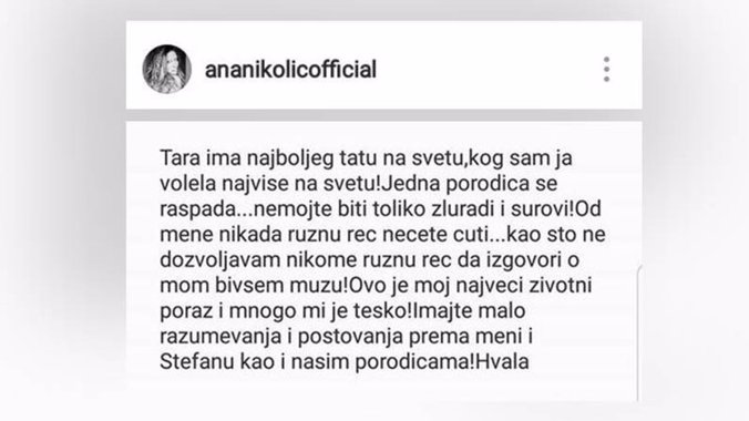 - Tara ima najboljeg tatu na svetu, kog sam ja volela najviše na svetu. Jedna porodica se raspada... Nemojte biti tako zluradi i surovi. Od mene nikada ružnu reč nećete čuti... Kao što ne dozvoljavam nikome ružnu reč da izgovori o mom bivšem mužu. Ovo je moj najveći životni poraz i mnogo mi je teško. Imajte malo razumevanja i poštovanja prema meni i Stefanu, kao i našim porodicama - napisala je pevačica.