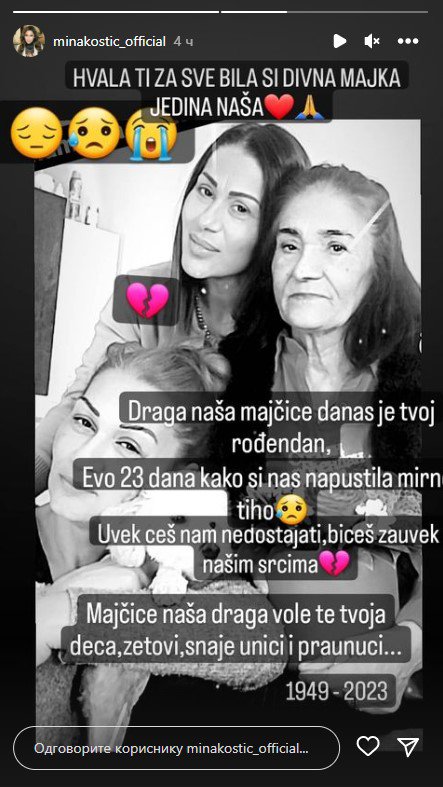 Hvala ti za sve, bila si divna majka, jedina naša. Draga naša majčice, danas je tvoj rođendan. Evo 23 dana kako si nas napustila mirno i tiho. Uvek ćeš nam nedostajati, bićeš zauvek u našim srcima. Majčice naša draga, vole te tvoja deca, zetovi, snaje, unuci i praunuci - napisala je Mina uz fotografiju sa pokojnom majkom.