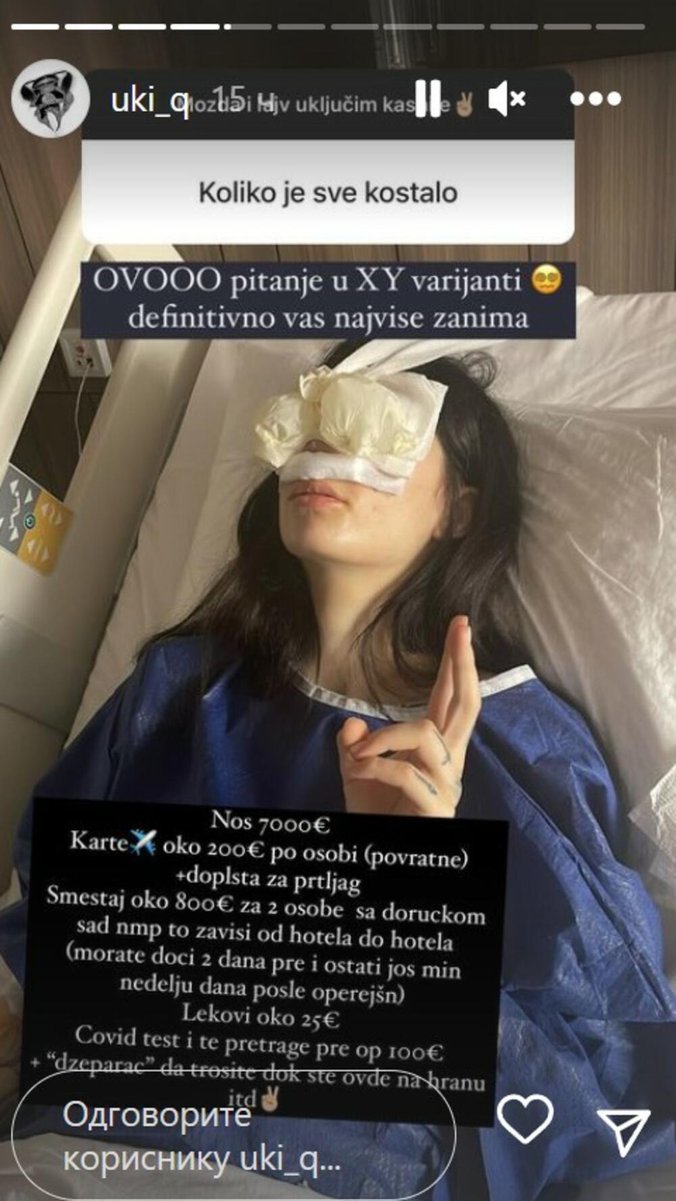 Uki je svojim pratiocima odgovarala na pitanja o operaciji koju je imala pre nedelju dana i na pitanje o ceni korekcije nosa napisala je sve taksativno.