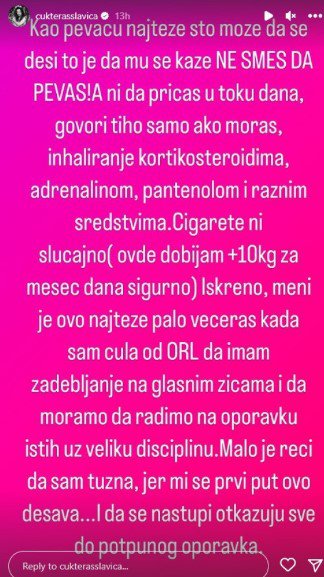 - Kao pevaču najteže što može da se desi, to je da vam se kaže: "Ne smeš da pevaš, a ni da pričaš preko dana, govori tiho, samo ako moraš." Inhaliranje kortikosteroidima, adrenalinom, pantenolom i raznim sredstvima. Cigarete ni slučano (ovde dobijam plus 10 kilograma za mesec dana, sigurno). Iskreno, meni je ovo najteže palo kada sam večeras čula od ORL da imam zadebljanje na glasnim žicama i da moramo da radimo na oporavku istih uz veliku disciplinu. Malo je reći da sam tužna, jer mi se prvi put ovo dešava i da se nastupi otkazuju sve do potpunog oporavka - poručila Slavica.