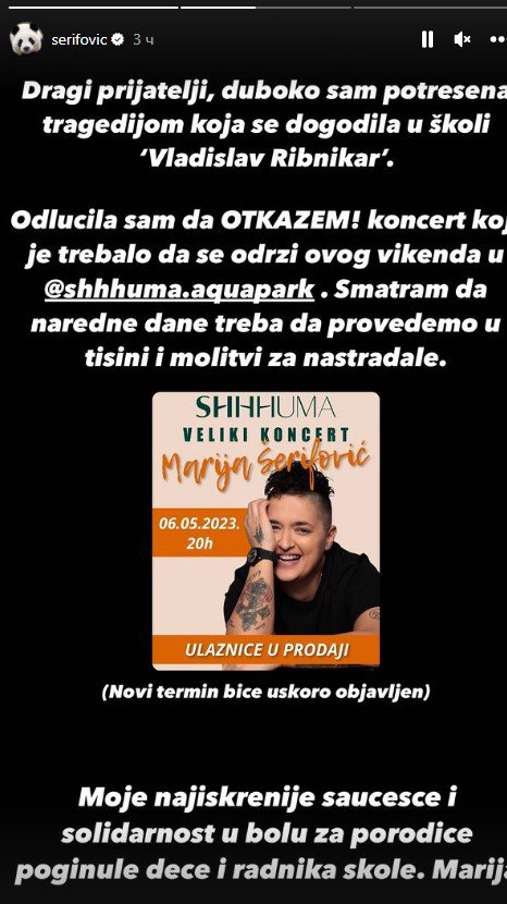 Dragi prijatelji, duboko sam potresena tragedijom koja se dogodila u školi Vladislav Ribrikar. Odlučila sam da otkažem koncert koji je trebao da se održi ovog vikenda. Smatram da naredne dane treba da provedemo u tišini i molitvi za nastradale. Moje najiskrenije saučešće i solidarnost u bolu za porodice poginule dece i radnika škole. Marija – napisala je pevačica na Instagramu.