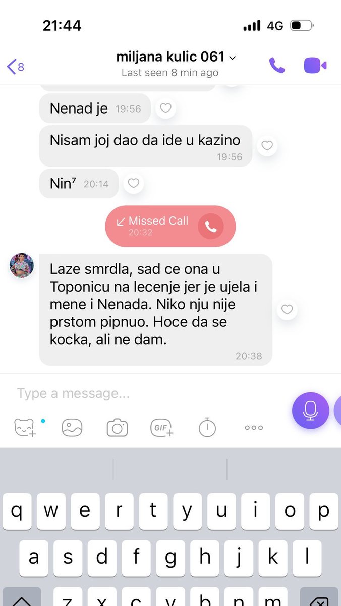Laže smrdla, sad će ona u Toponicu na lečenje jer je ujela i mene i Nenada. Niko nju nije prstom pipnuo. Hoće da se kocka, ali ne dam - napisala je Marija sa Miljaninog telefona koji joj je, po svemu sudeći, oduzet.
