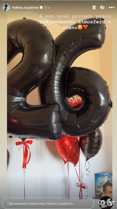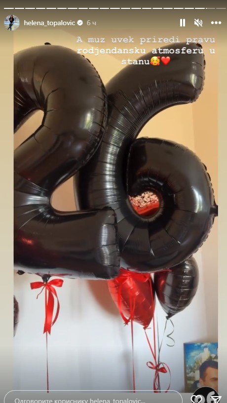 "A muž mi uvek priredi rođendansku atmosferu u stanu", napisala je Helena uz kadrove koje je objavila. Ona je pokazala da je njen dom ispunjen balonima crvene i crne boje, a neki od njih su bili u obliku srca, dok su najveći bili brojevi.