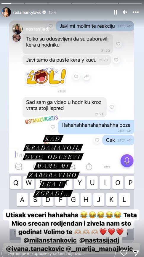 Ona je pre nekoliko dana slavila rođendan, a sad je na svom Instagramu objavila i prepisku sa Milanovom sestrom, iz koje se vidi da je njegova porodica toliko oduševljena iznenađenjem bivše snajke, da su i kućnog ljubimca zaboravili u hodniku zgrade.