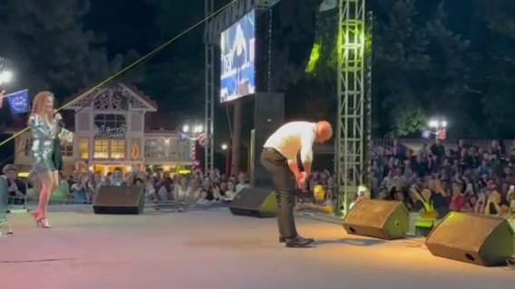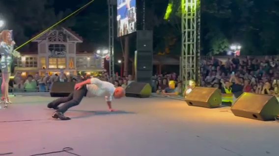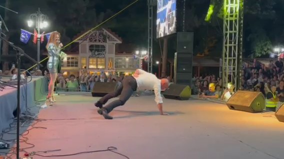 Pevač je zatim dobacio publici: "Deda nije za bacanje", skinuo sako koji je nosio, spustio se na binu i krenuo da radi sklekove i to na jednoj ruci. Publika ga je s oduševljenjem gledala i aplaudirala mu.