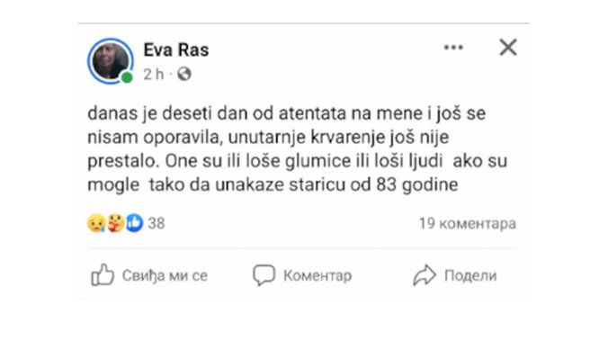 - Da sam poginula na snimanju, govorili bi da je to bio nesrećan splet okolnosti, ali ostala sam živa i mogu da tvrdim da je to bio atak na mene, da su me sa uživanjem gnječile kao vašku i da je bilo sasvim namerno, da nije tako ne bi bile ljute, ne bi prestale da komuniciraju sa mnom, ali one ćute i na setu, gaze i profesinalizam, ja im mutim um - započela je Eva stravičnu ispovest.- Deseti je dan od atentata na mene i još uvek se nisam oporavila. Unutrašnje krvarenje nije prestalo. One su ili loše glumice ili loši ljudi, ako su mogle da unakaze na takav način staricu od 83 godine - napisala je Eva jutros status putem svog profila na pomenutoj socijalnoj rmeži.