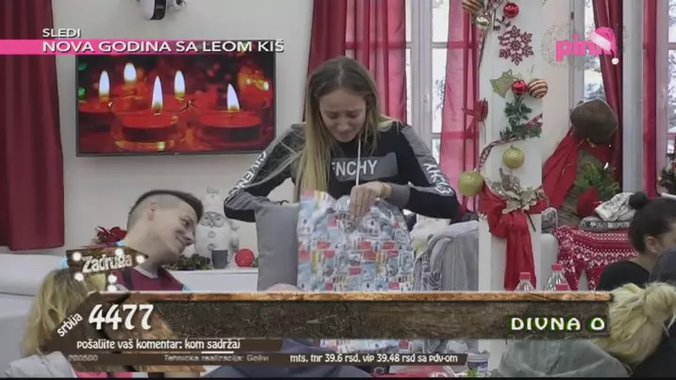 Zanimljiv poklon stigao je na adresu Divne DNK. Ova zadrugarka dobila je donji veš, a osmeh joj nije silazio sa lica, kao i ostalim ukućanima. Divna je ovom prilikom poželela srećnu Novu godinu svom mužu, ćerki i porodici. Iako je samo nekoliko minuta ranije Milica Dugalić rekla kako Maca neće dobiti poklon, Diskreciju je obradovao nepoznati pošiljalac parfemom.