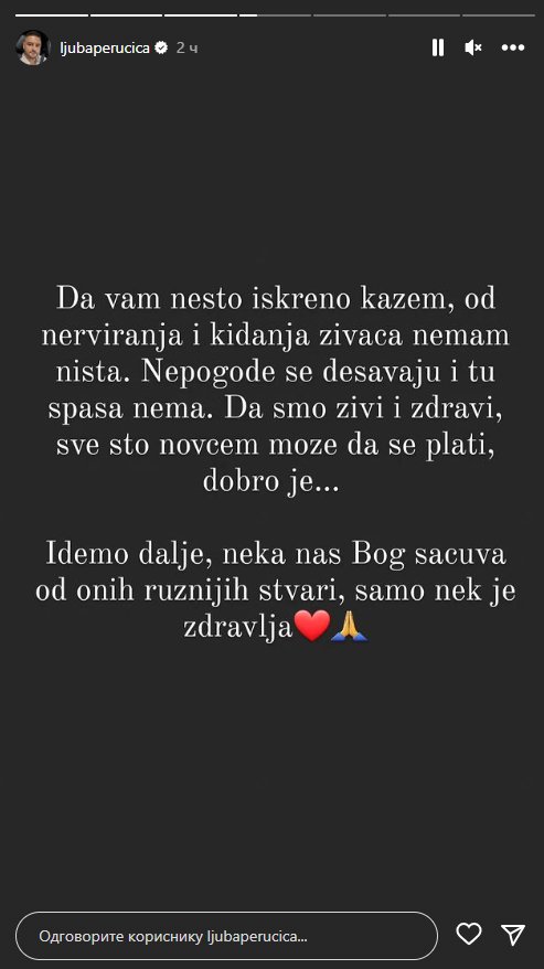 - Da vam nešto iskreno kažem, od nerviranja i kidanja živaca nemam ništa. Nepogode se dešavaju i tu spasa nema. Da smo živi i zdravi, sve što novcem može da se plati, dobro je... Idemo dalje, neka nas Bog sačuva od onih rzžnijih stvari, samo nek je zdravlja - napisao je Ljuba.