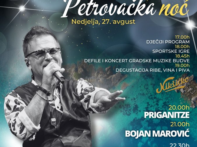 Na glavnoj bini ispred hotela „Palas“ od 21 sat nastupiće crnogorski pop pevač Bojan Marović, dok će hrvatska i regionalna muzička zvezda Džiboni svojim brojnim hitovima petrovačku publiku obradovati koncertom od 22 sata i 30 minuta.