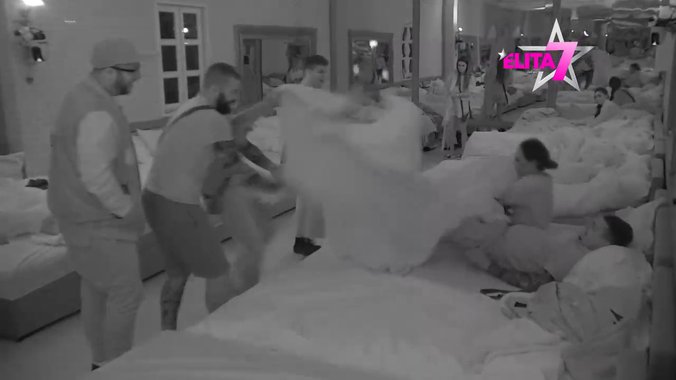 Sara Šljivar i Borislav Bora Terzić zavukli su se u krevet i čavrljali u ranim jutarnjim časovima dok u sobu nisu uleteli Nikola Lakić, Danijel Dujković i Uroš Stanić i poremetili im mir.