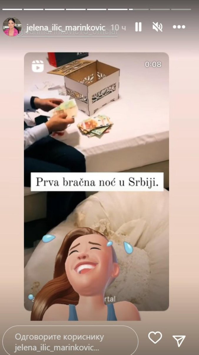 Novopečena mlada se potom i našlalila na njihov račun i objavila video na kojem se vidi kutija puna evrića i kako "mladoženja" broji pare, uz komentar: "Prva bračna noć u Srbiji".