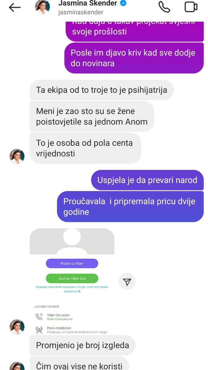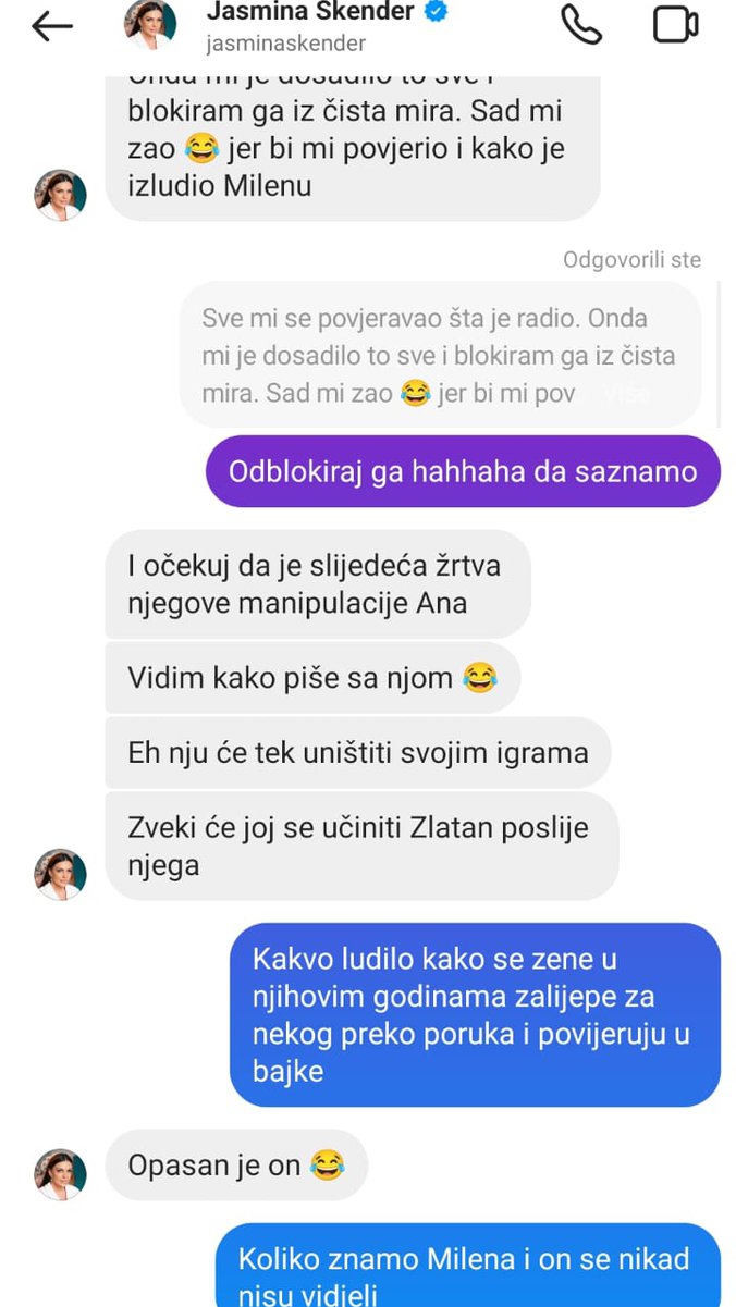 Ali, to nije sve! Portal Pink.rs došao je u posed ekskluzivnih skrinšotova u kojima Jasmina otkriva da sumnja da je sledeća žrtva njegove prevare upravo Ana Ćurčić, kojoj je, kako je Ćurčićeva istakla, otkrio da je živ i da je Milena slagala celu priču o njegovoj pogibiji.