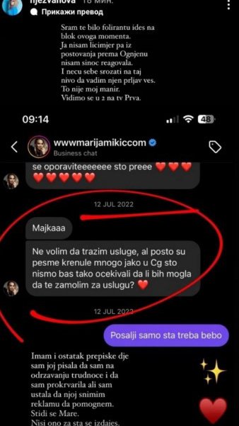 Ona je potom na Instagramu objavila i privatnu prepisku sa Marijom, gde joj ona traži uslugu.