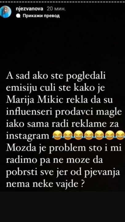 - A sad ako ste pogledali emisiju, čuli ste kako je Marija Mikić rekla da su influenseri prodavci magle, iako sama radi reklame za Instagram. Možda je problem što i mi radimo, pa ne može da pobrsti sve, jer od pevanja nema neke vajde? - krenula je Njezvanova.