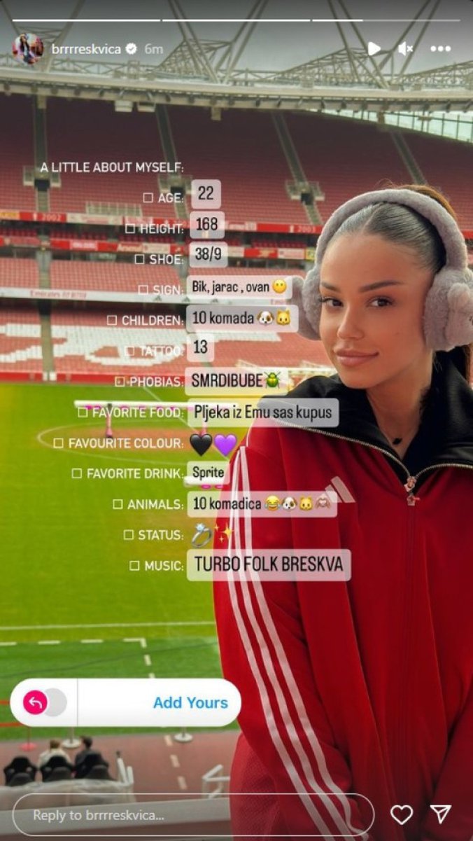 Breskvica te glasine nikada nije potvrdila, a sada je na Instagramu odgovorila na nekoliko "leksikonskih" pitanja, među kojima je i ljubavni status. Na ovo pitanje je opet objavila emitkon vereničkog prstena.