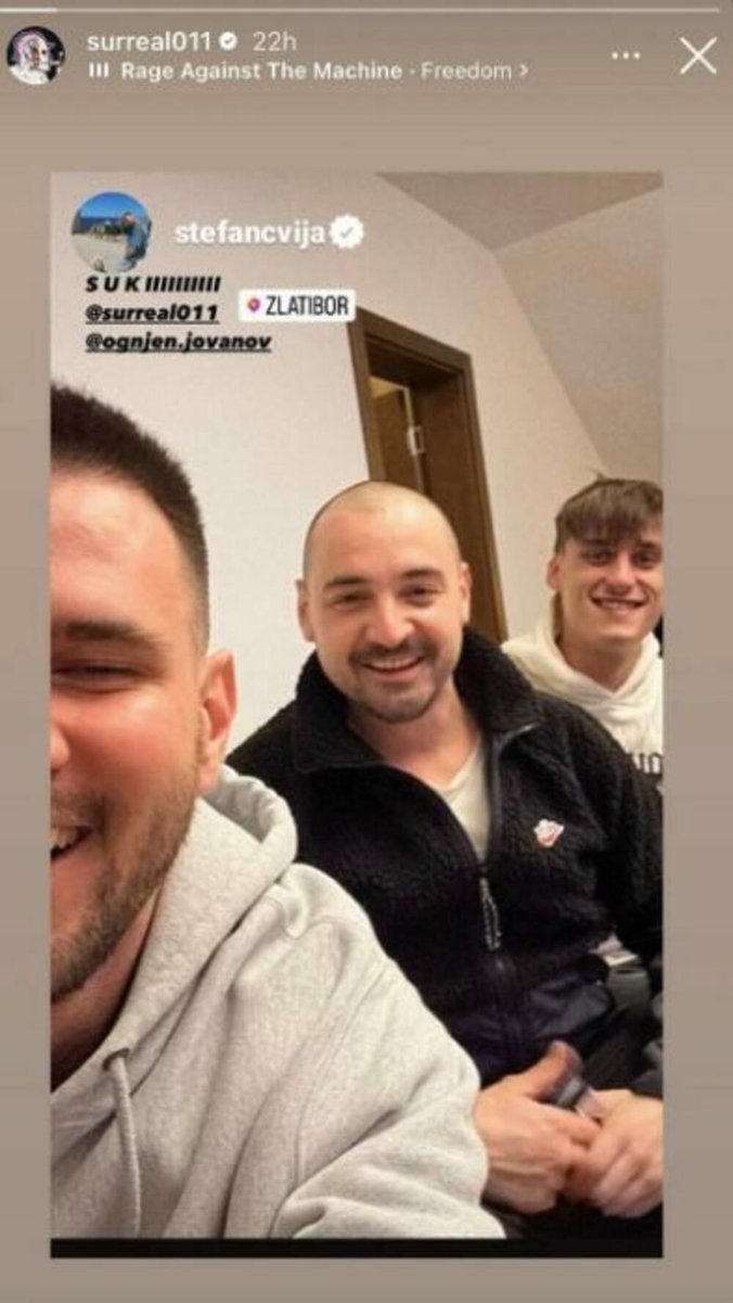 Repera su organi reda pustili posle 48 sati provedenih u pritvoru, a sudeći po fotografiji, ostao je na Zlatiboru. Prvu njegovu fotku objavio je njegov kolega i prijatelj, reper Stefan Cvijović Cvija, a bili su u društvu mladog pevača Ognjena Jovanova.