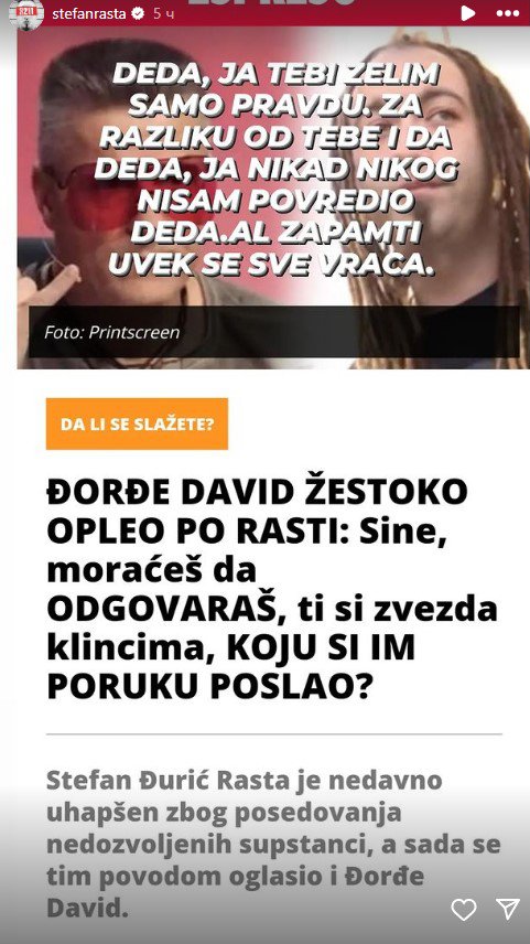 Deda, ja tebi želim samo pravdu. Za razliku od tebe, ja nikoga nikada nisam povredio, deda. Ali zapamti, uvek se sve vraća - napisao je Rasta.