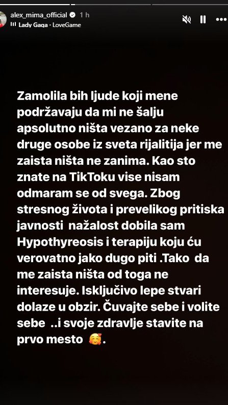 Ona je rekla da se ovo stanje javilo nakon stresnog života i prevelikog pritiska javnosti, pa je napomenula da više ništa ne zanima za osobe iz rijalitija, te da ne želi da još se više takva pitanja postavljaju.
