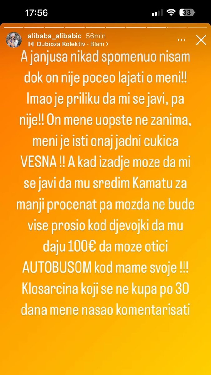 Janjuša nikad nisam spomenuo, dok on nije počeo lajati o meni. Imao je priliku da mi se javi, pa nije. On me uopšte ne zanima, meni je isti onaj jadni cukica Vesna, a kad izađe može da mi se javi da mu sredim kamatu za manji procenat, pa možda ne bude više prosio kod devojki da mu daju 100 eura da može otići autobusom kod svoje mame. Klošarčina koji se ne kupa po 30 dana, našao mene komentarisati - poručio je Asmin.
