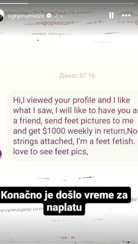 - Zdravo, pogledao sam tvoj profil i sviđa mi se ono što sam video, voleo bih da te imam za prijatelja, pošalji mi slike feeda i dobijaš 1000 dolara nedeljno. Bez obaveza. Ja imam fetiš stopala. Volim da vidim slike stopala - pisalo je u poruci koju je Ognjen objavio na svom storiju na Instagramu, a onda je voditelj dodao sledeće: