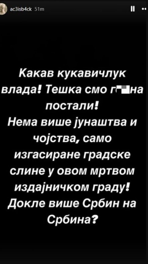 - Kakav kukavičluk vlada! Teška smo go*na postali! Nema više junaštva i čojstva, samo izgasirane gradske s*ine u ovom mrtvom izdajničkom gradu - napisao je on, pa dodao: