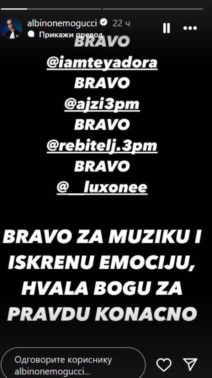 - Bravo, Teya Dora! Bravo za muziku i iskrenu emociju, hvala Bogu za pravdu konačno - napisao je a onda sve iznenadio.