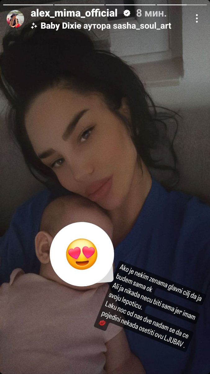 - Ako je nekim ženama glavni cilj da ja budem sama ok, ali ja nikada neću biti sama, jer imam svoju lepoticu. Laku noć od nas dve, nadam se da će pojedini nekad osetiti ovu ljubav - napisala je Aleks u okviru storija.