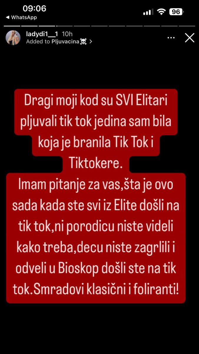 Dragi moji, dok su svi elitari pljuvali TikTok, jedina sam bila koja je branila TikTok i tiktokere. Imam pitanje za vas, šta je ovo sada, kada ste svi iz Elite došli na TikTok? Ni porodicu niste videli kako treba, decu niste zagrlili i odveli u bioskop, došli ste na TikTok. Smradovi klasični i foliranti - poručila je Lejdi Di.