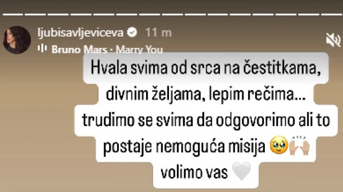 - Hvala svima od srca na čestitkama, divnim željama, lepim rečima... Trudimo se svima da odgovorimo, ali to postaje nemoguće misija. Volimo vas - napisala je Jovana na Instagram profilu.
