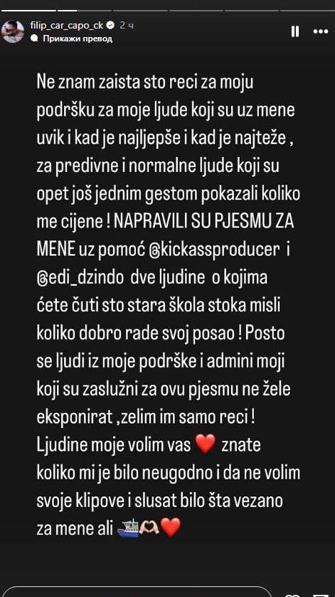 - Ne znam zaista šta da kažem za moju podršku i moje ljde koji su uvek uz mene i kada je najlepše i kada je najteže, za predivne i normalne ljude koji su opet još jednim gestom pokazali koliko me cene. Napravili su pesmu za mene... - napisao je Car.