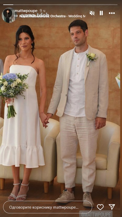 Ana i Mateja izgovorili su sudbonosno da na skromnoj proslavi bez velike pompe. A slavlje su upriličili na Kalemegdanu. Mlada je blistala u elegantnoj beloj haljini do ispod kolena, a kosu je vezala u diskretnu punđu. Mateja se odlučio za bež-belu kombinaciju te su izgledali prelepo usklađeni.