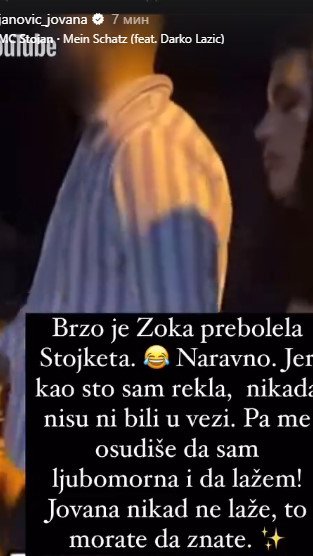 - Brzo je Zoka prebolela Stojketa. Naravno, kao što sam rekla, nikada nisu ni bili u vezi. Osudiše me da sam ljubomorna i da lažem. Jovana nikada ne laže, to morate da znate - kratko je napisala Jovana na svom Instagram nalogu.