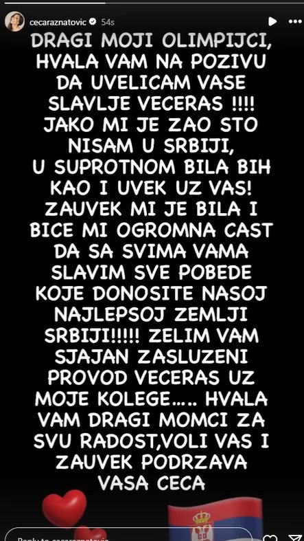 - Dragi moji olimpijci hvala vam na pozivu da uveličam vaše slavlje večeras. Jako mi je žao što nisam u Srbiji, u suprotnom bila bih kao i uvek uz vas. Zauvek mi je bila i biće mi ogromna čast da sa svima vama slavim sve pobede koje donosite našoj najlepšoj zemlji Srbiji. Želim vam sjajan zasluženi provod večeras uz moje kolege. Hvala vam dragi momci za svu radost, voli vas i zauvek podržava vaša Ceca - napisala je folk diva.