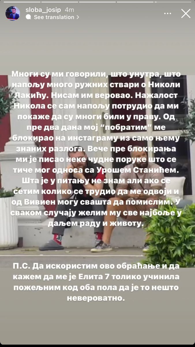- Mnogi su mi govorili, što unutra, što napolju mnogo ružnih stvari o Nikoli Lakiću. Nisam im verovao. Nažalost Nikola se sam napolju potrudio da mi pokaže da su mnogi bili u pravu. Od pre dva dana moj ''pobratim'' me blokirao na Instagramu iz njemu samo znanih razloga. Veče pre blokiranja mi je pisao neke čudne poruke što se tiče mog odnosa sa Urošem Stanićem. Šta je u pitanju ne znam, ali ako se setim koliko se trudio da me odvoji i od Viven, mogu svašta da pomislim. U svakom slučaju želim mu sve najbolje u daljem radu i životu - napisao je Sloba, pa dodao:
