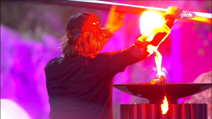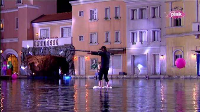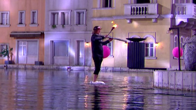 Oni su se tradiocionalno vozili jezerom, a onda je usledio pravi šok! Željko Mitrović je izašao iz gondole i počeo da hoda po vodi. On je zapalio plamen na Rajskom ostrvu.