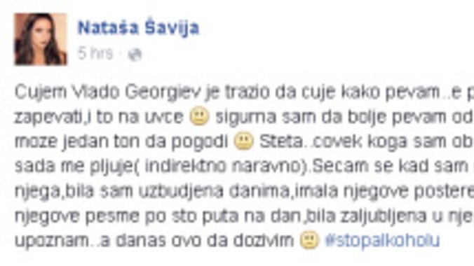 Starleta i pevačica Nataša Šavija očigledno se pronašla u tvitovima pevača Vlade Georgieva, te je rešila da mu u svom stilu odgovori. Doduše, samo na društvenoj mreži Fejsbuk.