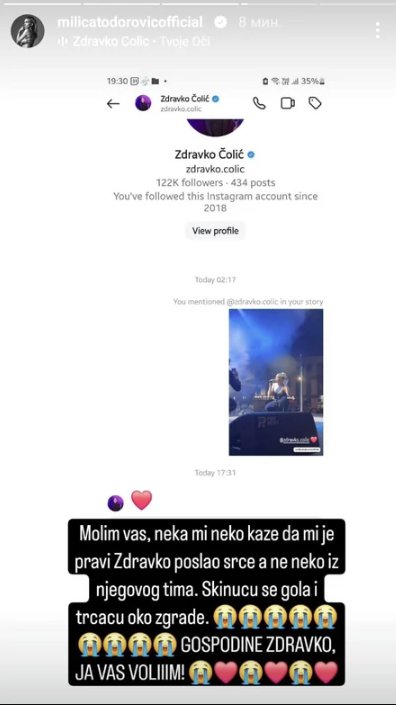 - Molim vas, neka mi neko kaže da mi je pravi Zdravko poslao srce, a ne neko iz njegovog tima. Skinuću se gola i trčaću oko zgrade! - napisala je u svom stilu i dodala: