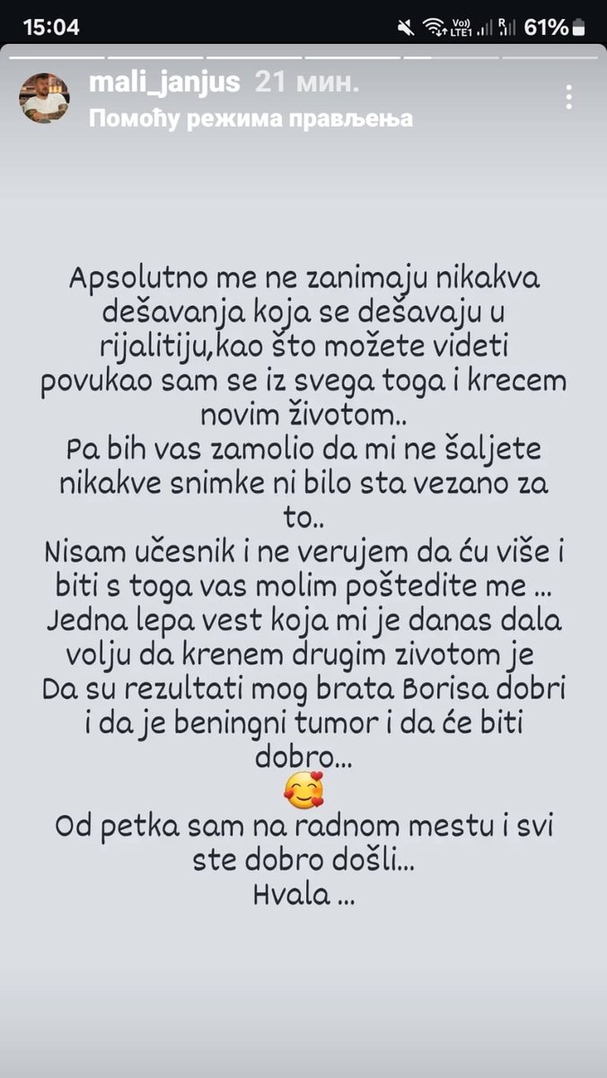 Janjuš se oglasio na Instagramu, iskreno o učešću u rijalitiju i bratu Borisu.