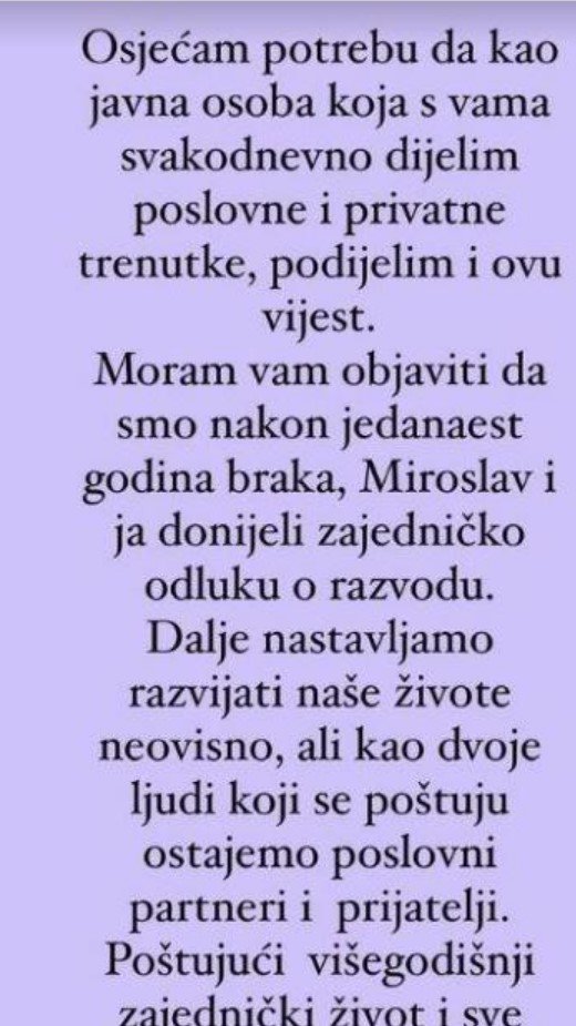 - Osećam potrebu da kao javna ličnost koja sa vama svakodnevno deli poslovne i privatne trenutke, podelim i ovu vest. Moram vas obavestiti da smo nakon 11 godina braka, Miroslav i ja doneli zajedničku odluku o razvodu. Dalje nastavljamo razvijati naše živote, odvojeno, ali kao dvoje ljudi koji se poštuju ostajemo poslovni partneri i prijatelji - poručila je Indira Levak na Instagramu.