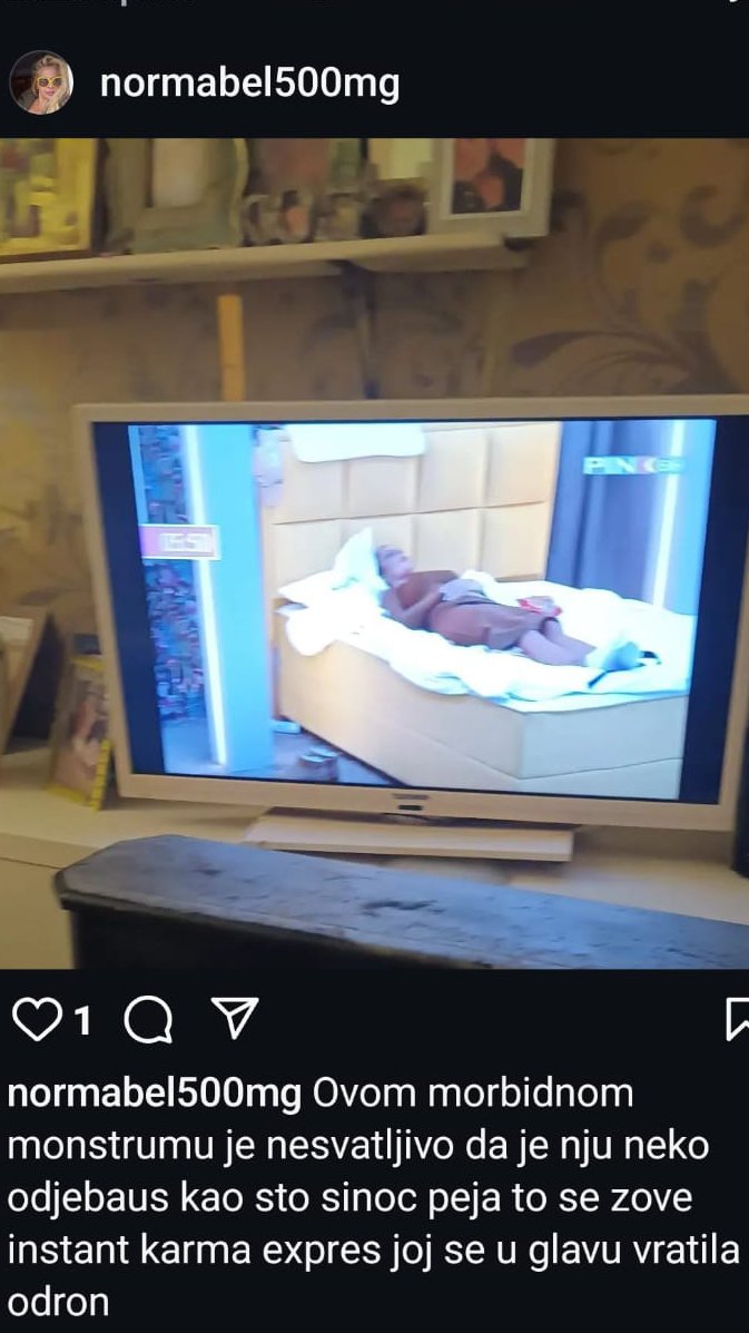 - Ovom morbidnom monstrumu je neshvatljivo da je nju neko odjebau, kao što je sinoć Peja. To se zove instant karma ekspres joj se u glavu vratila, odron - poručila je Jasmina.