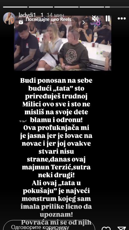 - Budu ponosan na sebe budući "tata" što priređuješ ovo sve trudnoj Milici i što ne misliš na svoje dete blamu i odronu - napisala je Lejdi pa dodala:
