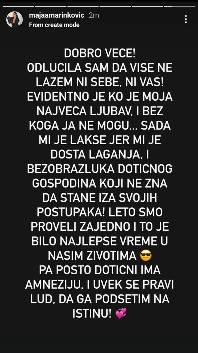 Sada se, prvi put nakon ovih dokaza, na svom instagram profilu oglasila Maja Marinković, koja je otkrila da su bili celo leto zajedno, ali sudeći po njenim rečima, nisu više zajedno.